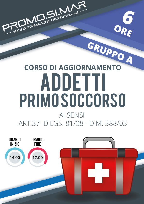 Il corso ha l’obiettivo di fornire, alle persone che in azienda rivestono il ruolo di Addetto al Primo Soccorso aziendale (in quanto nominati), una formazione specifica articolata in lezioni teoriche e pratiche, in modo da poter adempiere correttamente le funzioni previste dal ruolo ricoperto.